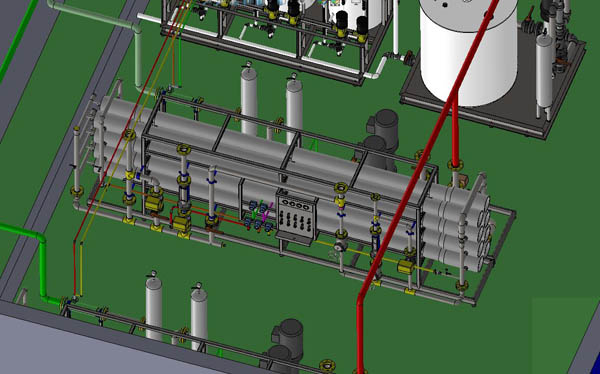 本項(xiàng)目設(shè)計(jì)總產(chǎn)水量50 m3/h(處理系統(tǒng)采用平行的兩套系統(tǒng),加藥及控制系統(tǒng)一套),產(chǎn)水率不低于65%。新增回用水深度處理系統(tǒng),選用低壓反滲透設(shè)備,對(duì)MBR池出水進(jìn)行深度處理。系統(tǒng)采用保安過濾器-反滲透系統(tǒng)。從回用水箱取水,通過反滲透系統(tǒng)后,濃水通過總排放口進(jìn)行排放,反滲透出水端流入本項(xiàng)目內(nèi)新增的100m3不銹鋼產(chǎn)水箱及配套水泵到使用點(diǎn),進(jìn)水和出水分別與回用水箱和聯(lián)合站房水池水位聯(lián)動(dòng)。